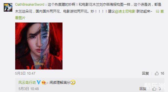 因此有人猜测:一方面是网易和迪士尼如此良好的合作关系,另一方面是因为花木兰电影因疫情迟迟不能上映,与网易热门游戏风云岛行动进行联动,在游戏里推出一个“刘亦菲花木兰”的联动皮肤,在电影上映之前维持热度也是有可能的。