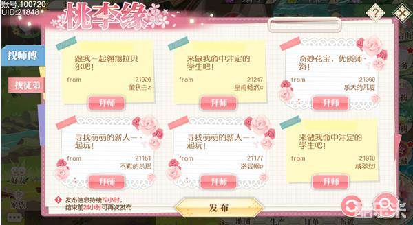 点击寻找导师按钮后,就可打开桃李缘面板。在该面板中有找师傅和找徒弟功能,身为萌新自然点击找师傅,在该面板中查看收徒留言,和你比较契合的就点击拜师去试试啦!而身为拉贝尔老司机自然点击找徒弟(达到50级后才能成为导师哦),看看哪个萌新的留言更能戳你心窝。