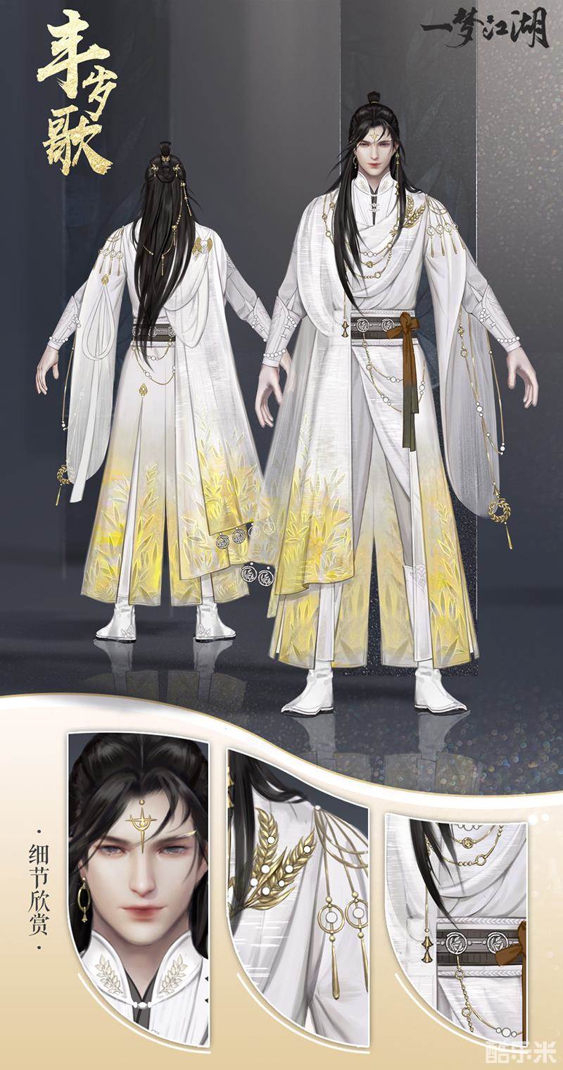 《一梦江湖》小满时装“丰岁歌”通体采用了错落的黄白配色,薄如蝉翼的上衣上点缀着各种象征丰收的细小装饰,精致而美丽。闪着金属光泽的细链交叠衣前,乱中有序,交织出一种别致的美感。