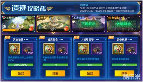 活动内容:遗迹攻略战本周开放天使龙城地区的限时任务和基础任务,完成每个任务即可领取丰厚奖励!完成对应地区下所有基础任务,还可领取额外奖励!