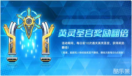 活动内容: 活动期间,每日前10次通关英灵圣宫,即可获得奖励翻倍大福利!(首通奖励、星数宝箱和人物经验奖励不翻倍,翻倍次数每日5点刷新)