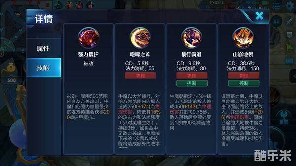 咆哮之斧:牛魔的一技能使用后能够对范围内的敌人造成一定的物理伤害,命中的敌人将会在一段时间内降低的攻击力和法术强度,并且使得牛魔接下来的一次攻击造成额外的法术伤害。这是一个很好的辅助技能。