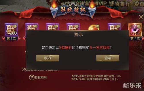 4月30日10:00至5月15日23:59期间,只需要花费510点魔石激活五一狂欢特权,就可以存储 5 月 1 日 00:00 至 5 月 7 日 23:59 期间没有使用的神火古域挑战次数。