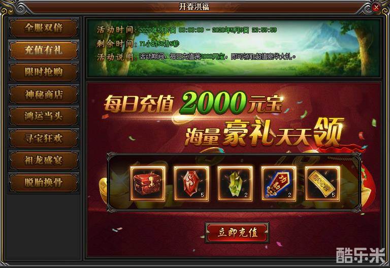 活动说明:活动期间,每日充值满2000元宝,即可领取超值豪华大礼!