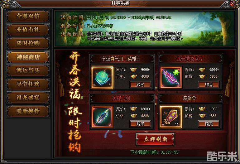 活动说明 : 活动期间,神秘商店倾情促销稀有材料!商店物品每2小时自动刷新(或全商品全部已购后),消耗一定元宝可手动刷新。