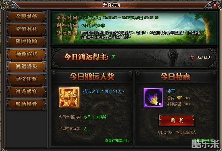 活动说明 : 玩家购买特惠礼包可获得幸运数字。每日21:00点抽取今日幸运数字,拥有该数字的玩家即可获得今日鸿运大奖。