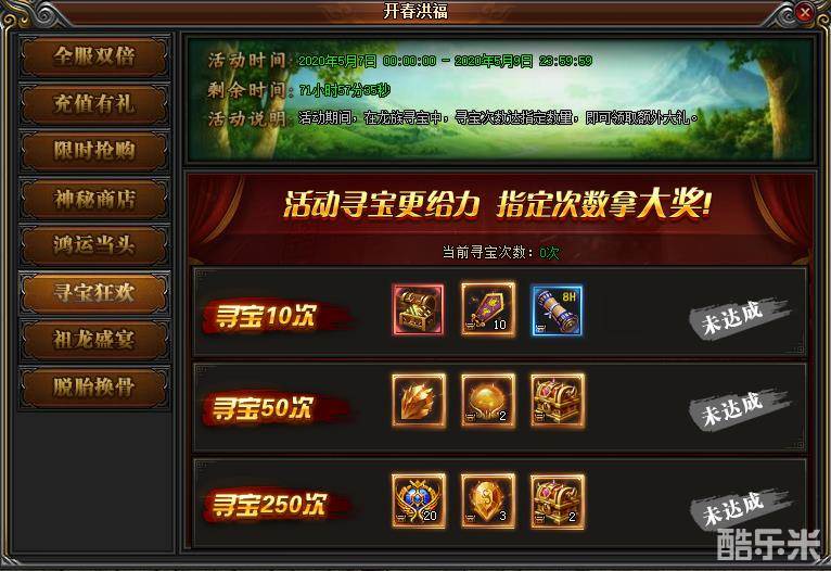 活动说明:活动期间,在龙族寻宝中,寻宝次数达指定数量,即可领取大礼。