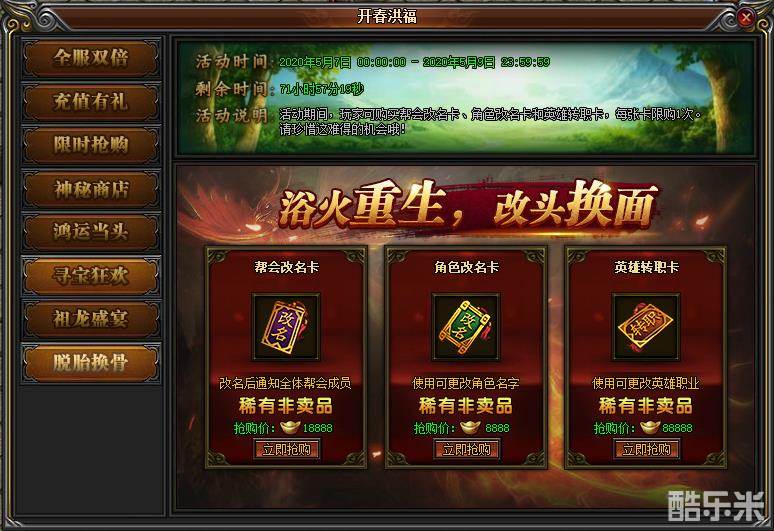 活动说明:活动期间,玩家可购买帮会改名卡、角色改名卡和权益重置卡,每张卡限购1次。请珍惜这难得的机会哦!