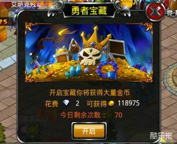 游戏中最直接的获得金币方式,每天有一次免费开启,之后根据玩家的VIP等级进行次数限制,同时也需要一定钻石开启,第一次为2钻,之后每次消耗的钻石呈递增上涨。玩家可以在此开启大量金币,但同时开启的次数越多消耗的钻石也越多,玩家可以根据自身情况来选择最优的开启次数。