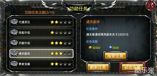 功勋任务除了能获得功勋以外,还能获得大量金币。每天玩家可完成十次功勋任务,每个功勋任务分为1-5星,越高星级的任务奖励也越多,运气好的玩家可以出现五星任务,同时也可以点击“必出五星”,消耗20钻石刷新五星任务,获得最高奖励。