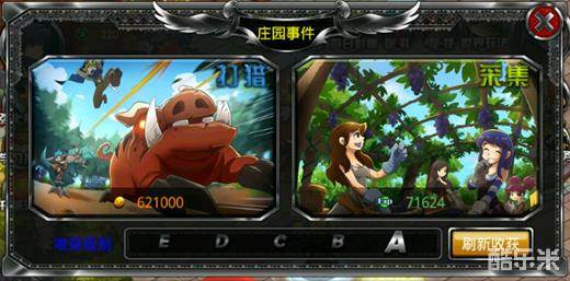 庄园事件每次可以收获大量金币,收获级别为A~E,最低的E级别也有11w+的金币,玩家也可以刷新收获级别来获取更多的金币,最高A级别为62w+金币。