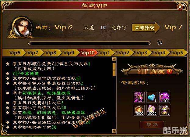 玩家VIP等级达到要求可领取丰厚VIP特权和奖励,包括全套的新区VIP专属白金套装,终生仅此一次机会。