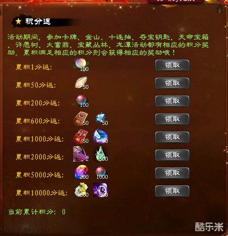 活动期间,玩家参与消费活动提升自己的实力时,均可获得消费积分,积分累积满额就可领取七重大奖。具体奖励如下: