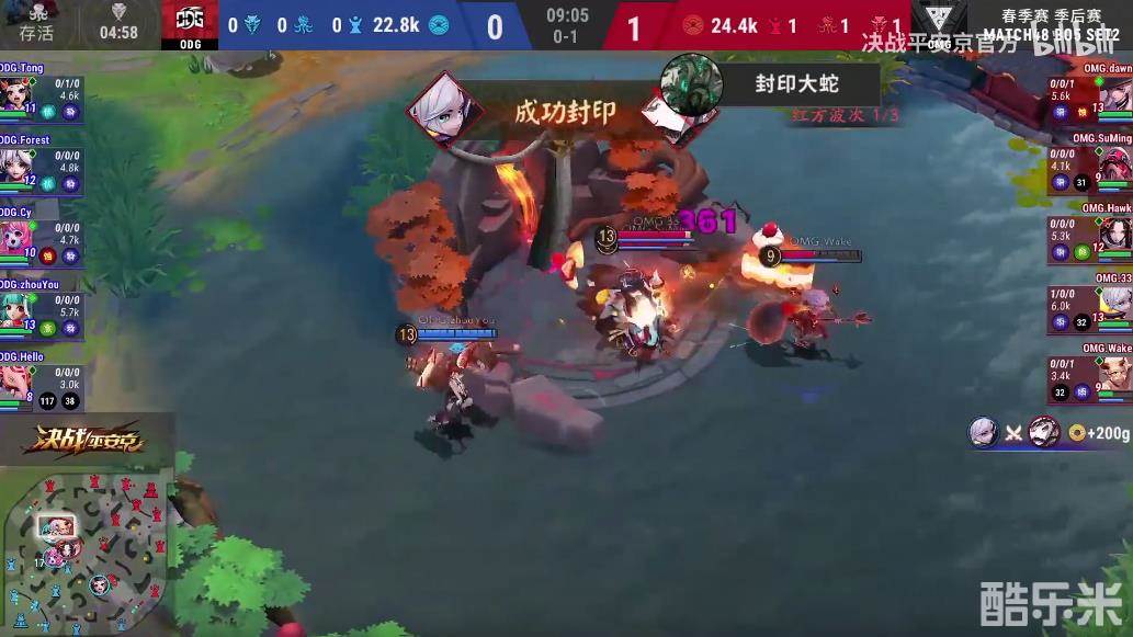第二条大蛇,ODG的跳妹乱军之中切死OMG射手妖狐,OMG丧失输出被迫让蛇。年兽之战时,OMG打野被ODG射手首无秒杀,未开局先减员,OMG最终被兵围城下,比赛进入最终决胜局。