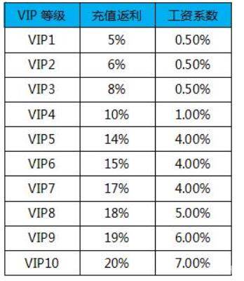 凡是在欢乐园平台充值月充值500RMB以上,成为平台VIP之后每次充值,都可获得返利;累计充值越高,可获得的返利额度越高。每月月初还可领取平台发放的工资福利哦!(每月可领取工资=上月充值金额*VIP等级工资系数;)