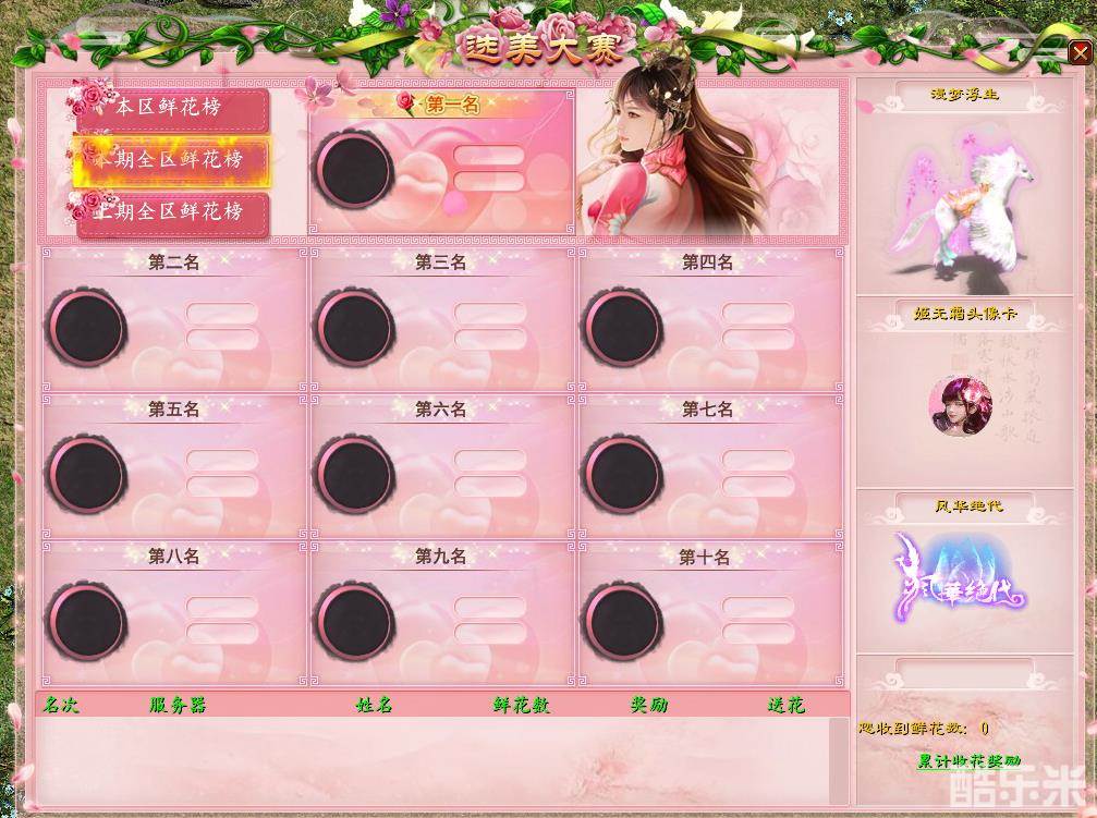 本期选美奖励:坐骑漫梦浮生、姬无双头像卡。