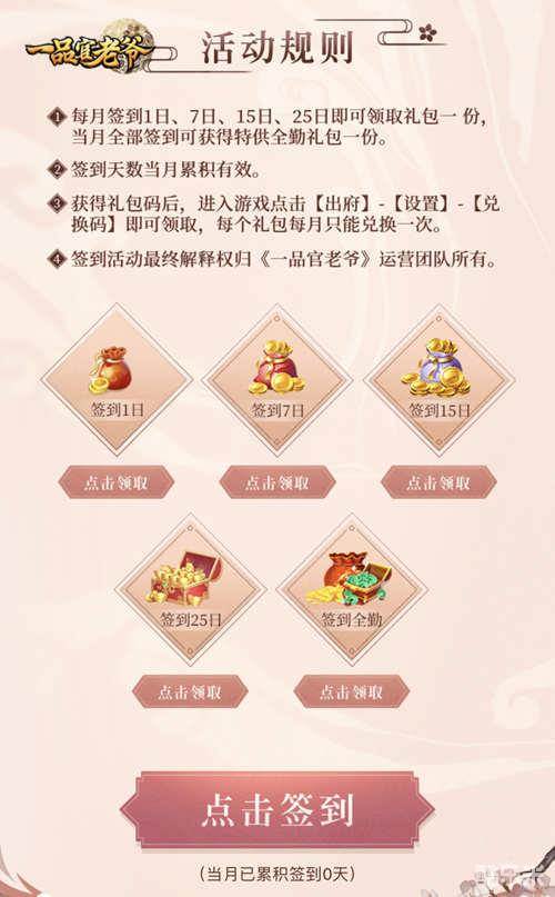 五月签到福利如何领取呢?各位大人请关注【一品官老爷手游】公众号,在单栏-福利活动内,点击签到活动进入页面。从今天开始,每天来点一点,签到完成就能领礼包!就算只签到了一天也有福利拿!