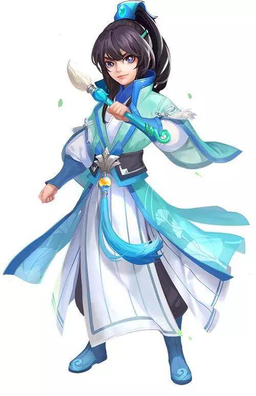男款时装以古风书生服作为设计灵感,乌黑的头发在头顶整齐地束起,蓝绿色的冰丝外袍飘逸优雅,融入了书生的儒雅与彬彬气质,手执绘笔,平日酷炫拉风的武器也隐藏了起来,执笔画红尘,寻访河山,书写传世名作。