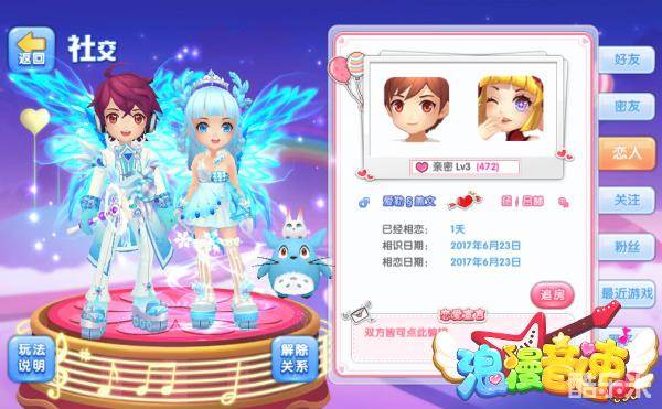 成为恋人后双方头像会变为特殊的爱心背景(要求双方在相邻位置),同时房间播放礼花特效庆祝双方结为情侣。