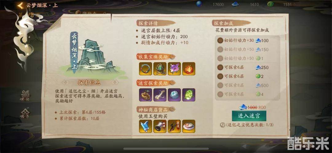 选择一个迷宫进入后,左侧栏显示上次探索层数、格数和累计探索层数等资讯,中间显示迷宫层数上限、初始行动力、探索奖励等当前探索详情,右侧则是供降妖师选择的探索加成,如增加初始行动力、增加可探索层数等。