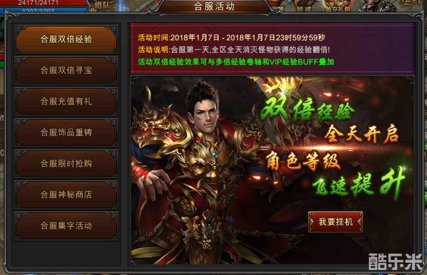 活动说明:合服第一天,全区全天消灭怪物获得的经验翻倍!