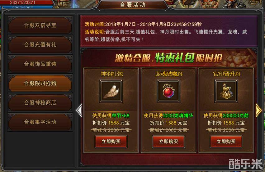 活动说明: 合服后前三天,超值礼包、神丹限时出售。飞速提升光翼、龙魂、威名等阶,超低价格,机不可失!