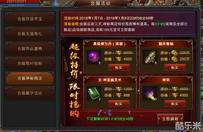 活动说明: 合服后前三天,神秘商店特价甩卖稀有道具。每2小时(或商品全部已购后)自动刷新商品,消耗199元宝可立即刷新