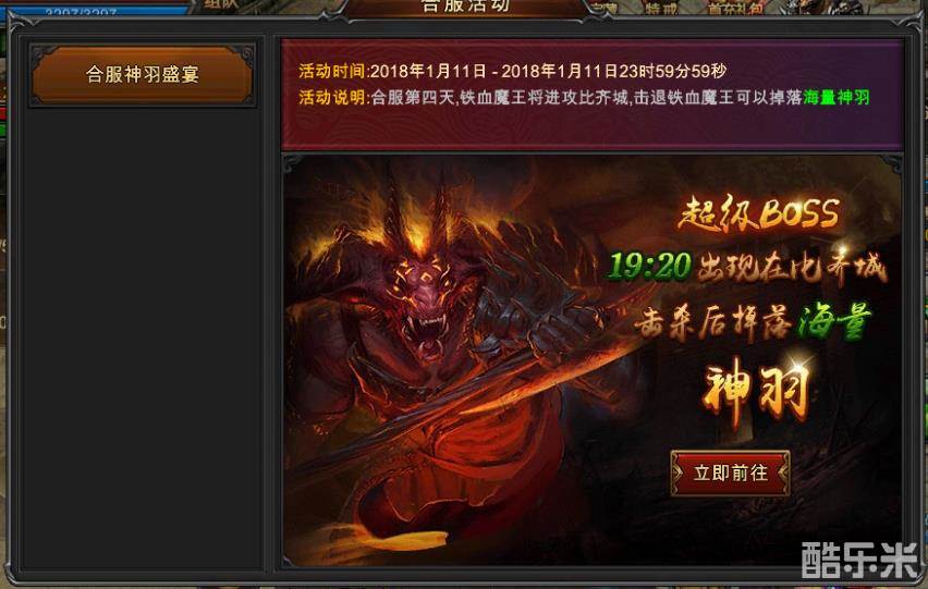 活动说明:合服第四天,铁血魔王将进攻比奇城,击退铁血魔王可以掉落海量神羽