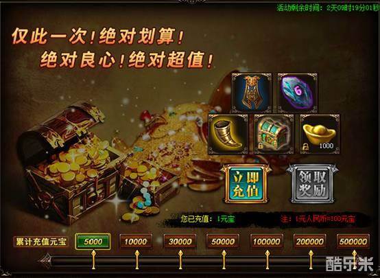 【活动内容】:开服后,累计充值达到奖励领取条件即可领取对应礼包,活动期间累计充值50W元宝,则可领取全部的开服活动奖励内容
