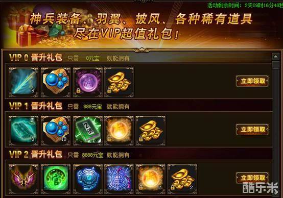 【活动内容】:VIP0以上均可领取一份超值礼包,每达到一个VIP等级均可领领取对应的VIP等级礼包。