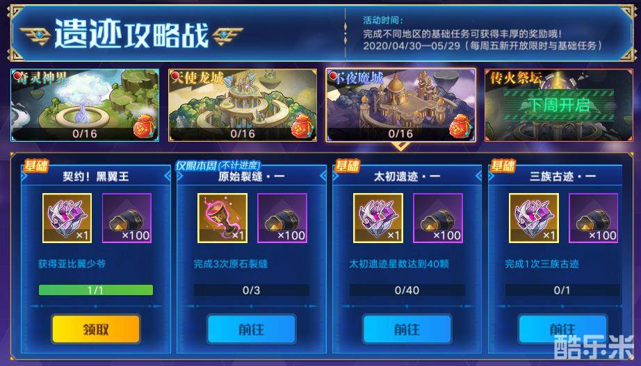 活动内容:遗迹攻略战本周开放不夜魔城地区的限时任务和基础任务,完成每个任务即可领取丰厚奖励!完成对应地区下所有基础任务,还可领取额外奖励!