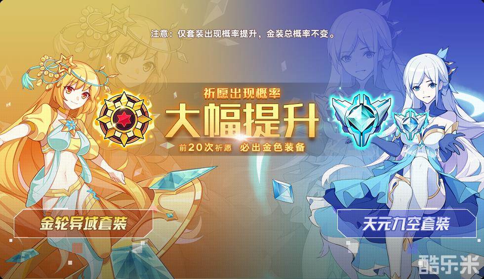 活动内容:超值福利回馈,人气金装祈愿池开启,两大金装套装奖池任你选!人气金装和金装碎片出现概率大提升,每个祈愿池前20次祈愿必出对应奖池金装,机不可失,快来参与!