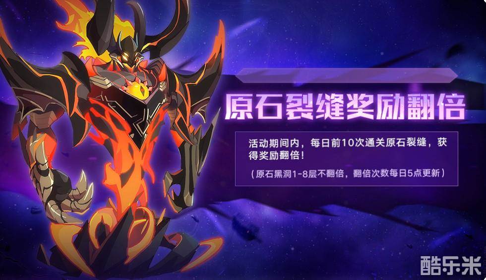 活动内容: 活动期间,每日前10次通关原石裂缝,即可获得奖励翻倍大福利!(原石黑洞1-8层奖励不翻倍,翻倍次数每日5点刷新)
