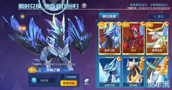 活动内容:绝版亚比回归开启!本期一共有至高之眼、冰霜巨龙、苍穹圣龙、后羿、奥天、东皇极、青龙、白虎、朱雀、玄武、薇拉、阿努比斯、奥奇、芭比鹿等亚比回归,可使用奥拉晶石兑换亚比的契约/进化/突破状态哦!