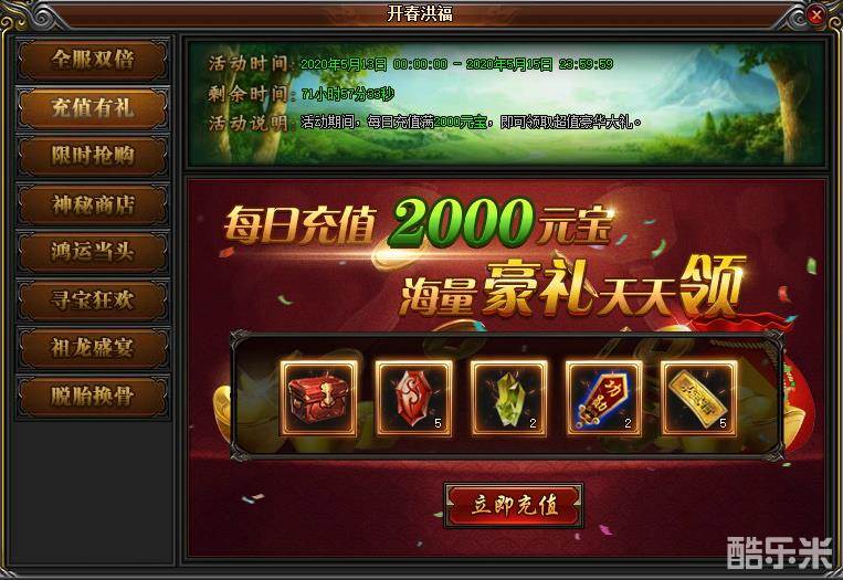 活动说明:活动期间,每日充值满2000元宝,即可领取超值豪华大礼!