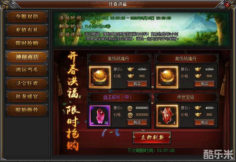 活动说明 : 活动期间,神秘商店倾情促销稀有材料!商店物品每2小时自动刷新(或全商品全部已购后),消耗一定元宝可手动刷新。