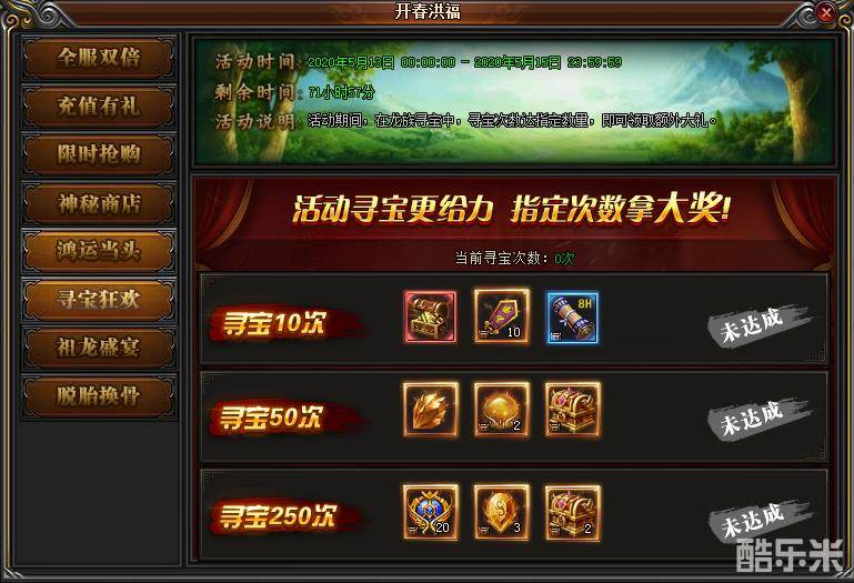 活动说明:活动期间,在龙族寻宝中,寻宝次数达指定数量,即可领取大礼。