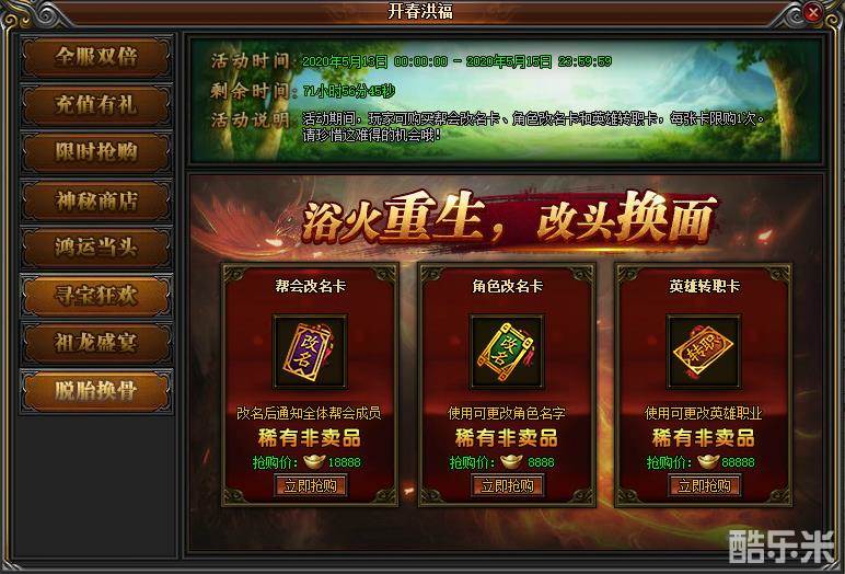 活动说明:活动期间,玩家可购买帮会改名卡、角色改名卡和权益重置卡,每张卡限购1次。请珍惜这难得的机会哦!