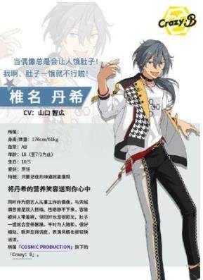 椎名丹希是一位同时作为厨艺人从事工作的音乐学员,与天城燐音曾是双人搭档。现在,椎名丹希和天城燐音都在所属于「COSMIC PRODUCTION」旗下的「Crazy:B」活跃着。或许是因为作为厨艺人的缘故,椎名丹希很难忍受饥饿,肚子一饿就会变得暴躁。不过,这也是椎名丹希独特的魅力之一呢!