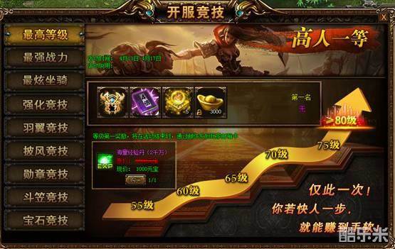 【活动内容】:开服后,率先达到设定等级、战力、坐骑、强化、羽翼、披风、勋章、斗笠、宝石等系统目标的玩家即可领取丰厚奖励,先到先得,名额有限哦!活动结束时,每项第一且的玩家还可以丰富道具奖励!