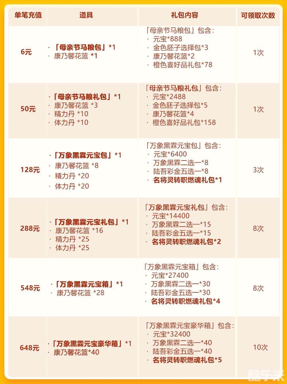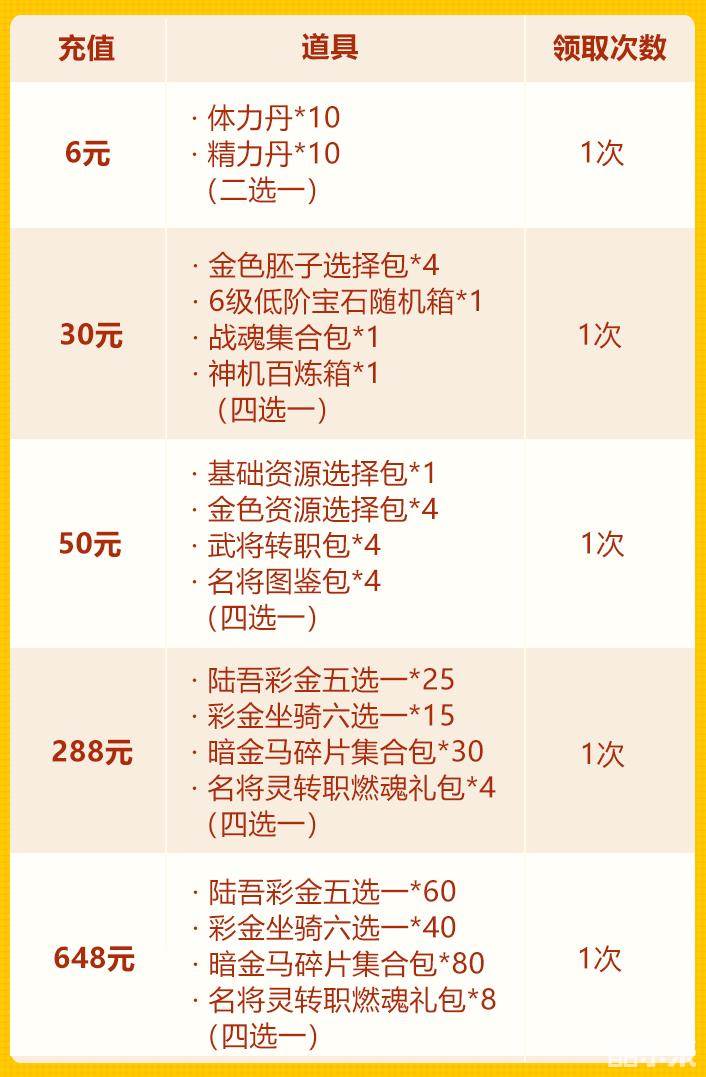 在活动期间少年们单笔充值至指定金额,即可获得元宝、万象黑霖二选一、陆吾彩金五选一、名将灵转职燃魂礼包、康乃馨花篮等资源: