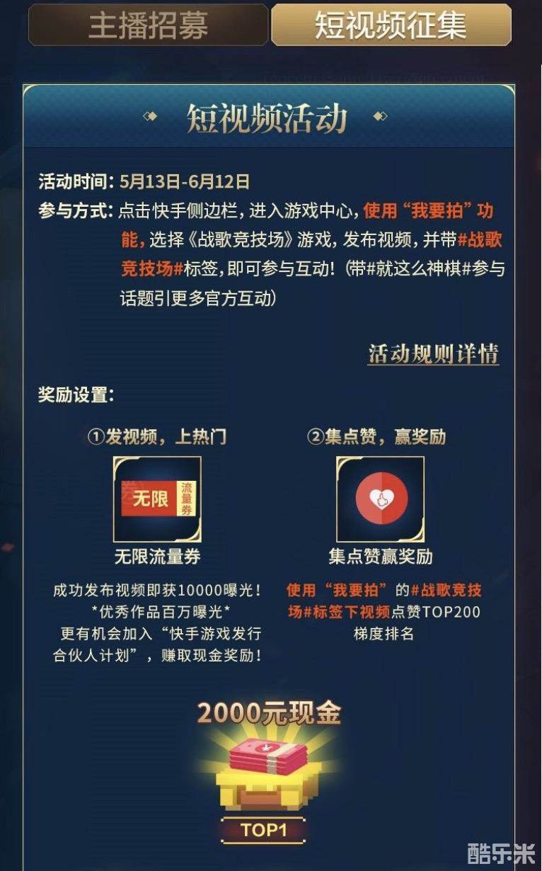5月13日-6月12日,点击快手侧边栏,进入游戏中心,使用“我要拍“功能,选择《战歌竞技场》游戏,发布视频,并带#战歌竞技场#标签,即可参与互动,成功发布视频即获10000曝光!视频点赞TOP200更有现金奖励和京东卡等你来拿!还等什么,快来一起下棋吧~