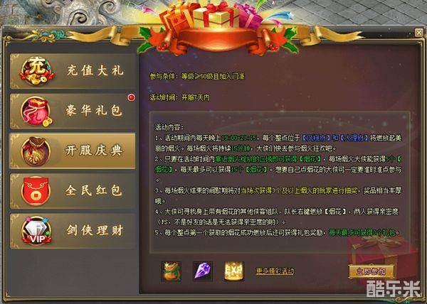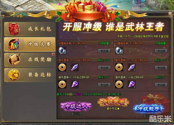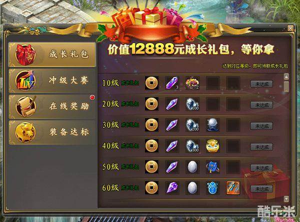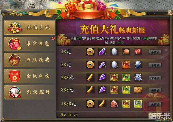 活动内容:开服30天内,充值达到对应金额即可领取奖励。每个账号下,限1个角色领取。