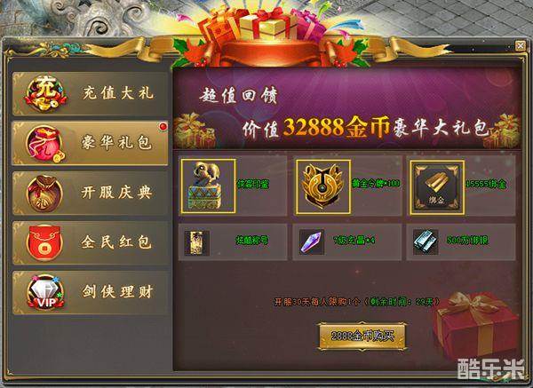 活动内容:活动时间内使用2888金币即可获赠12倍超值回馈豪华礼包,内含侠客印鉴、500万绑定银两、15555绑定金币、7级玄晶、还有稀有道具黄金令牌,可用来升级装备。超值回馈不容错过!