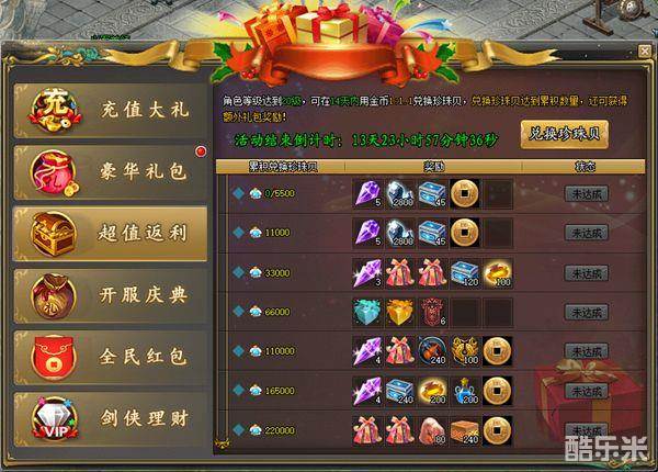 活动内容:活动时间内使用金币兑换一定比例兑换的珍珠贝,兑换数量达到累计数量可以获得礼包奖励。
