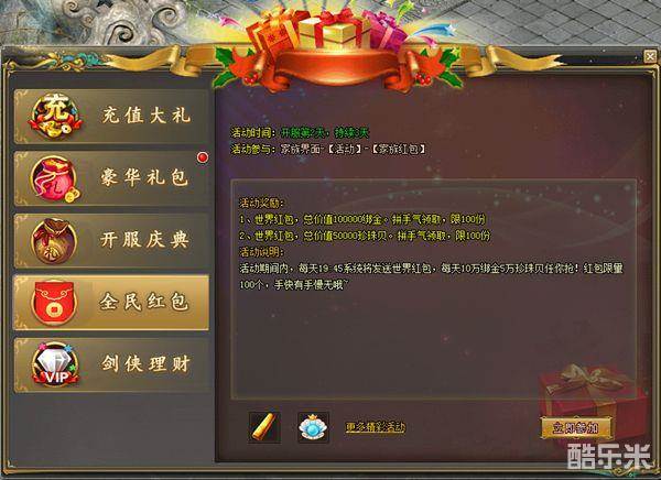 活动期间内,每天19:45系统将向全区全服发送世界红包,每天10万绑金5万珍珠贝任你抢!