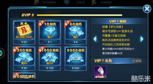 冒着被跪机械键盘充的V7,这个建议有能力的玩家都搞一个,毕竟送游戏中的最强奥特曼梦比优斯,能抗能打还能奶,我的妈,有了他,你周围的朋友都会用崇拜的眼光看你,从此走上人生巅峰,而且组队可以三倍奖励,大大减少了时间,VIP7一次更比3次强!