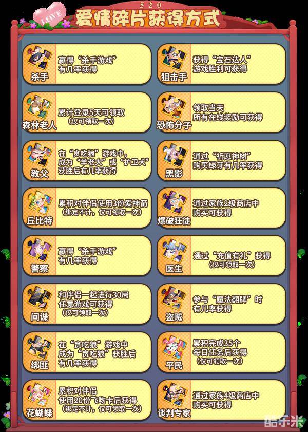 活动期间,帮助他们找到另一半吧!通过特别的游戏任务即可获得角色碎片,每当集齐一对完整碎片时,就能获得他们为您准备的奖励!