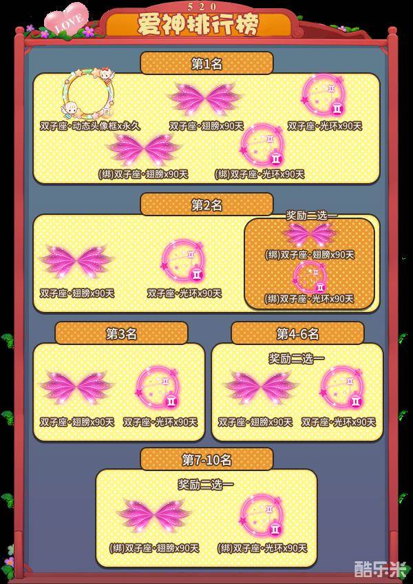 活动结束后,积分增长最多的前十名玩家获得“爱神排行榜”奖励。