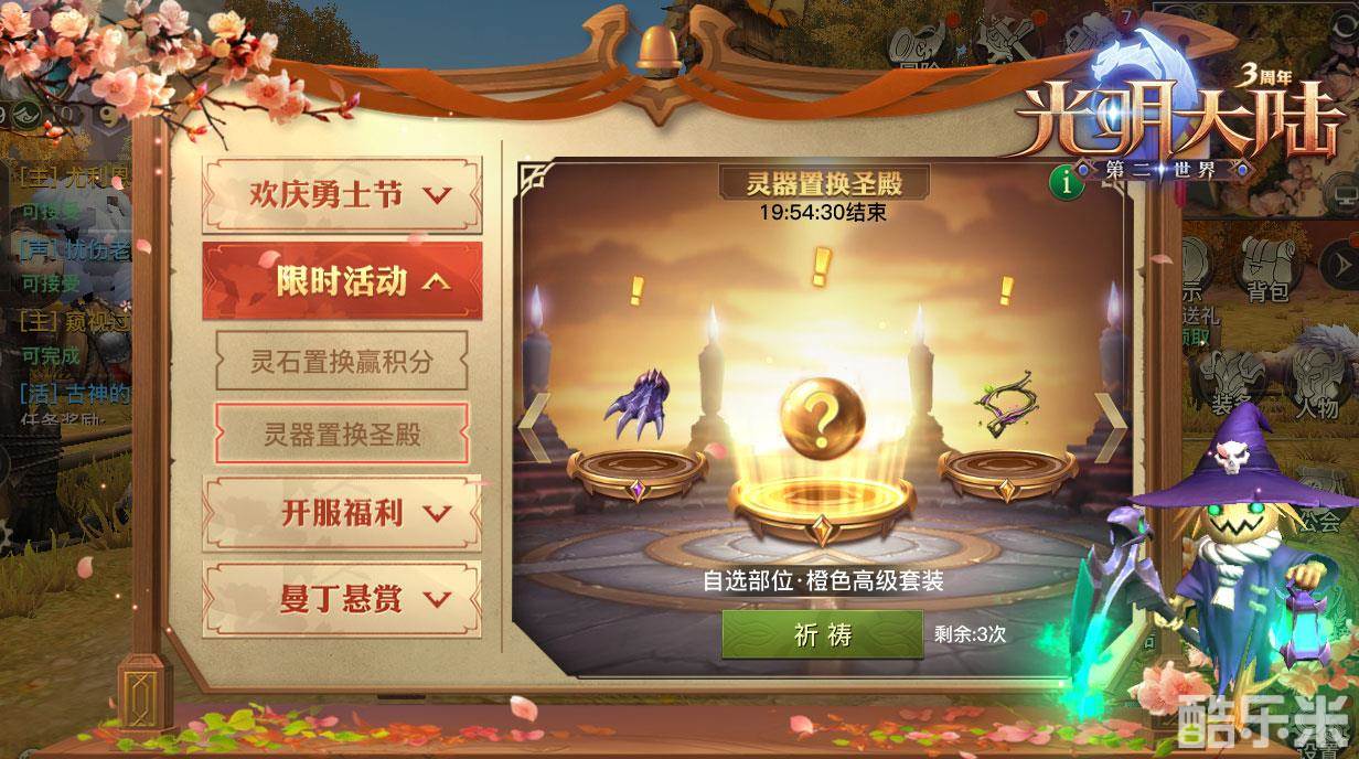 当处于“附灵助力”活动周时,勇士们使用指定数量的任意灵晶时将获得附灵商人给与的额外奖励,并且在限时活动中的灵器置换圣殿界面中用一定数量的灵器兑换获得指定部位的更高品质或套装的灵器。